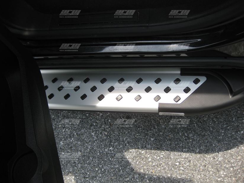 • This side step is made of an extruded silver aluminum frame and stylized molded end-caps for a finished look. • The step area is completed with black plastic board. • The installation brackets are produced by laser cutting technology for perfection from 4 mm ST052 steel sheets and galvanized.