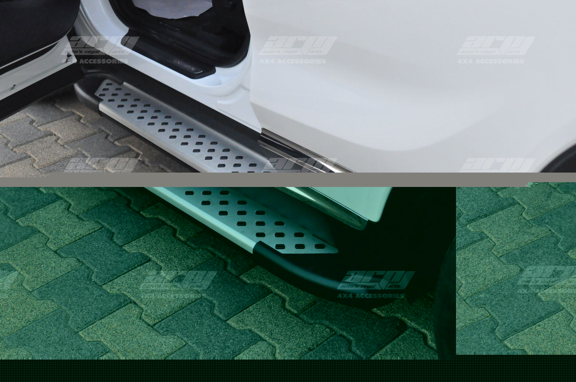 • This side step is made of an extruded silver aluminum frame and stylized molded end-caps for a finished look. • The step area is completed with black plastic board. • The installation brackets are produced by laser cutting technology for perfection from 4 mm ST052 steel sheets and galvanized.